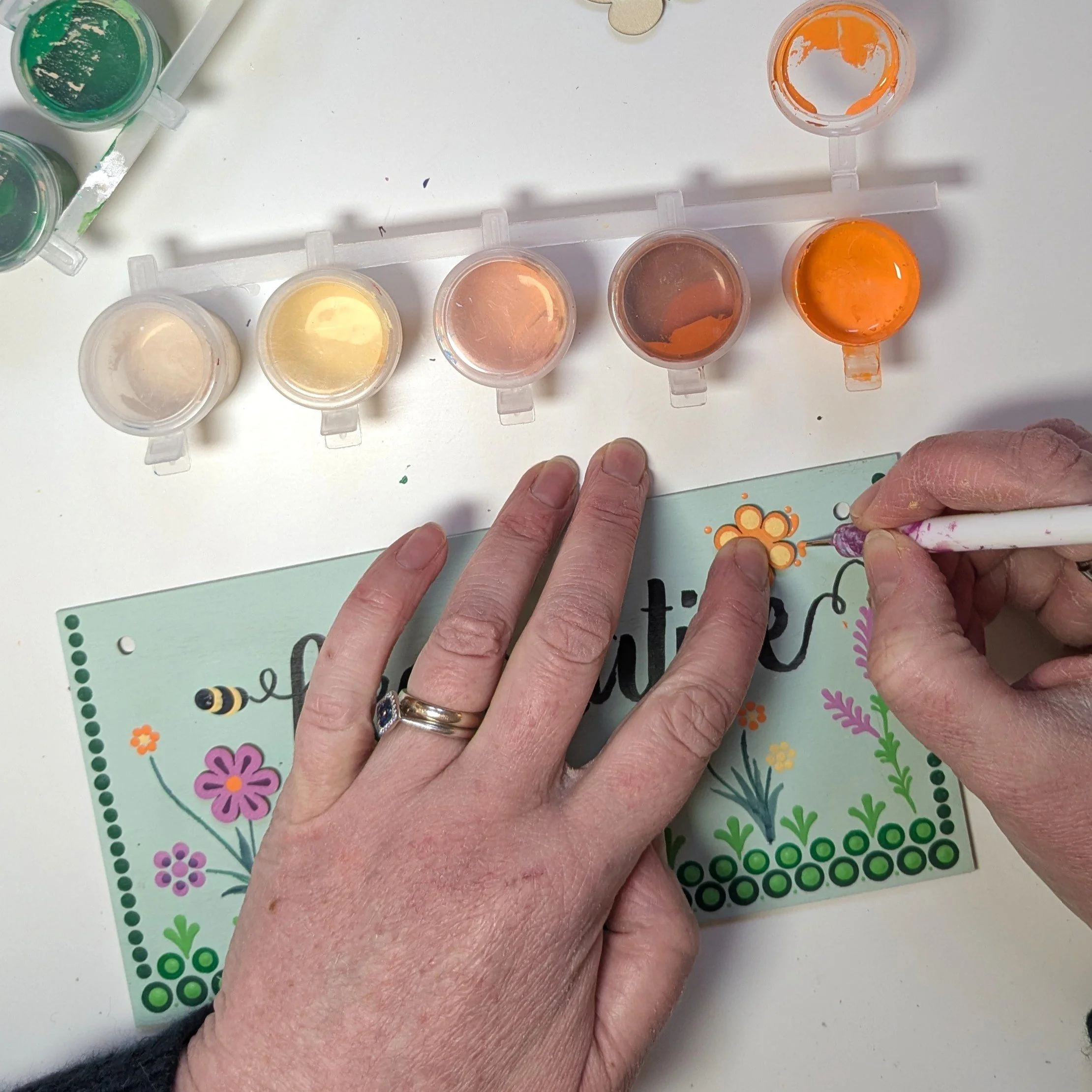 The wooden plaques will have a basecoat in a variety of colours to choose from. You will choose a short phrase to write on your plaque using acrylic pens. You will then create patterns and images using dotting techniques. Dot mandala art uses colour, repetition, symmetry and creativity which enhances wellbeing and concentration.